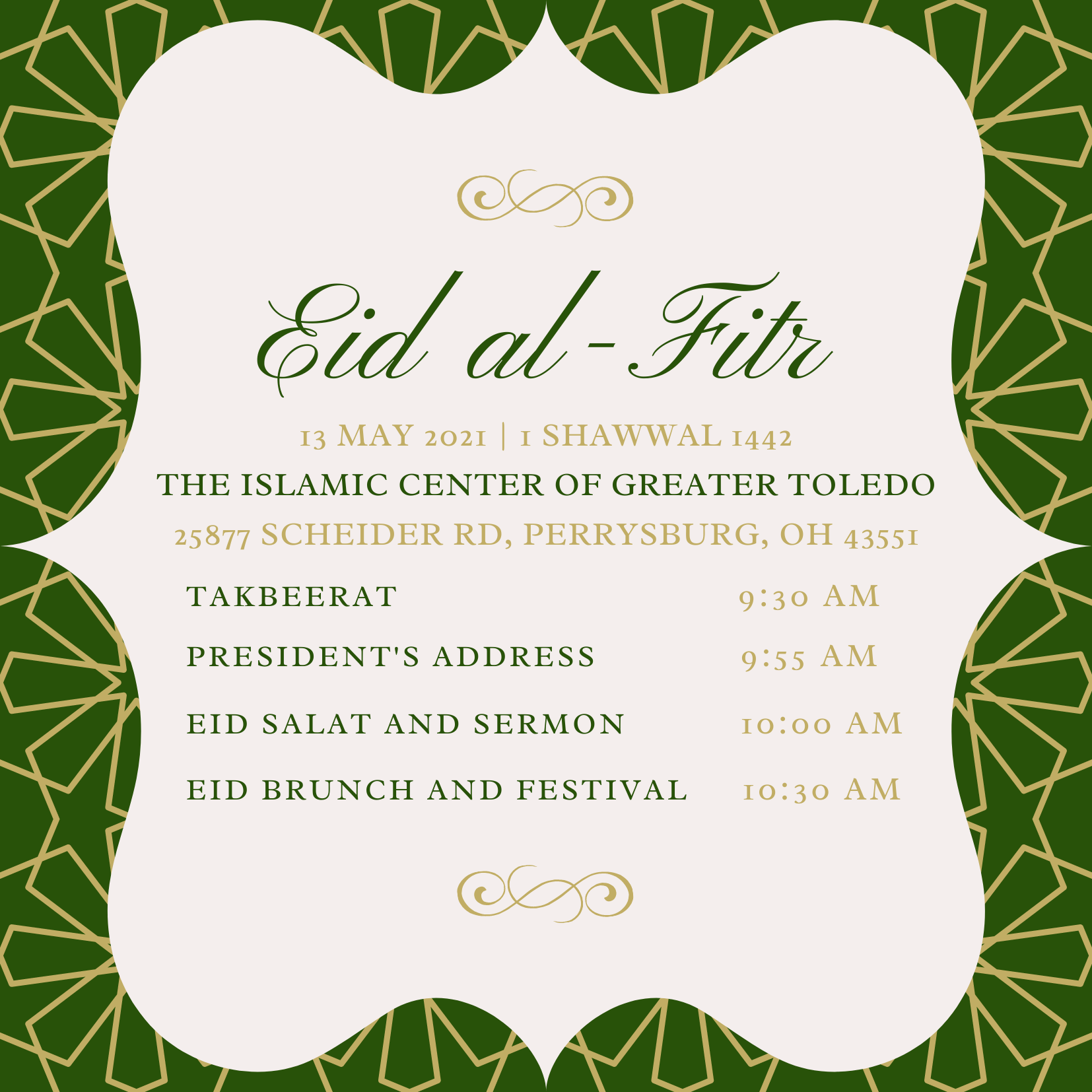 The Islamic Center of Greater Toledo invites you and your families to come celebrate Eid al-Fitr with us on May 13. Takbeer will begin at 9:30 am, followed by salat at 10 am sharp. There will be a full lunch served to the community including a Middle Eastern and Pakistani barbeque as well as multiple […]